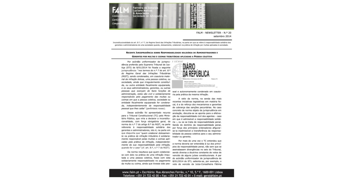 Recente jurisprudência sobre responsabilidade solidária de administradores e gerentes por multas e coimas tributárias aplicadas a pessoa coletiva.