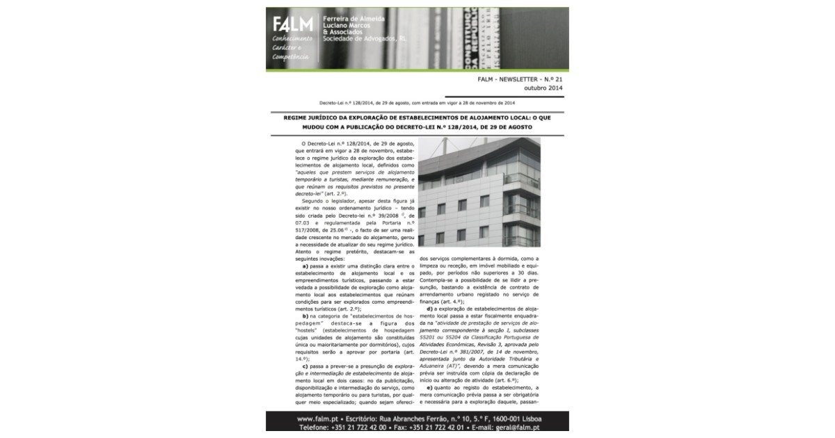 Regime jurídico da exploração de estabelecimento de alojamento local: o que mudou com a publicação do Decreto-Lei n.º 128/2014, de 29 de agosto.