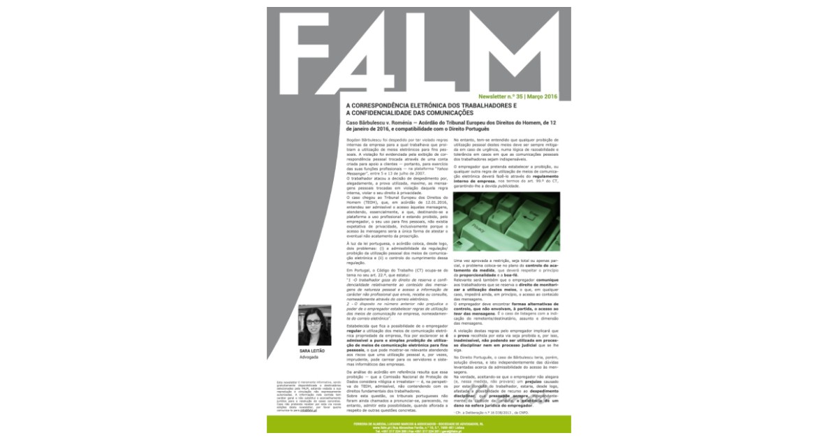 A correspondência eletrónica dos trabalhadores e a confidencialidade das comunicações. Caso Bărbulescu v. Roménia — Acórdão do Tribunal Europeu dos Direitos do Homem, de 12 de janeiro de 2016, e compatibilidade com o Direito Português.