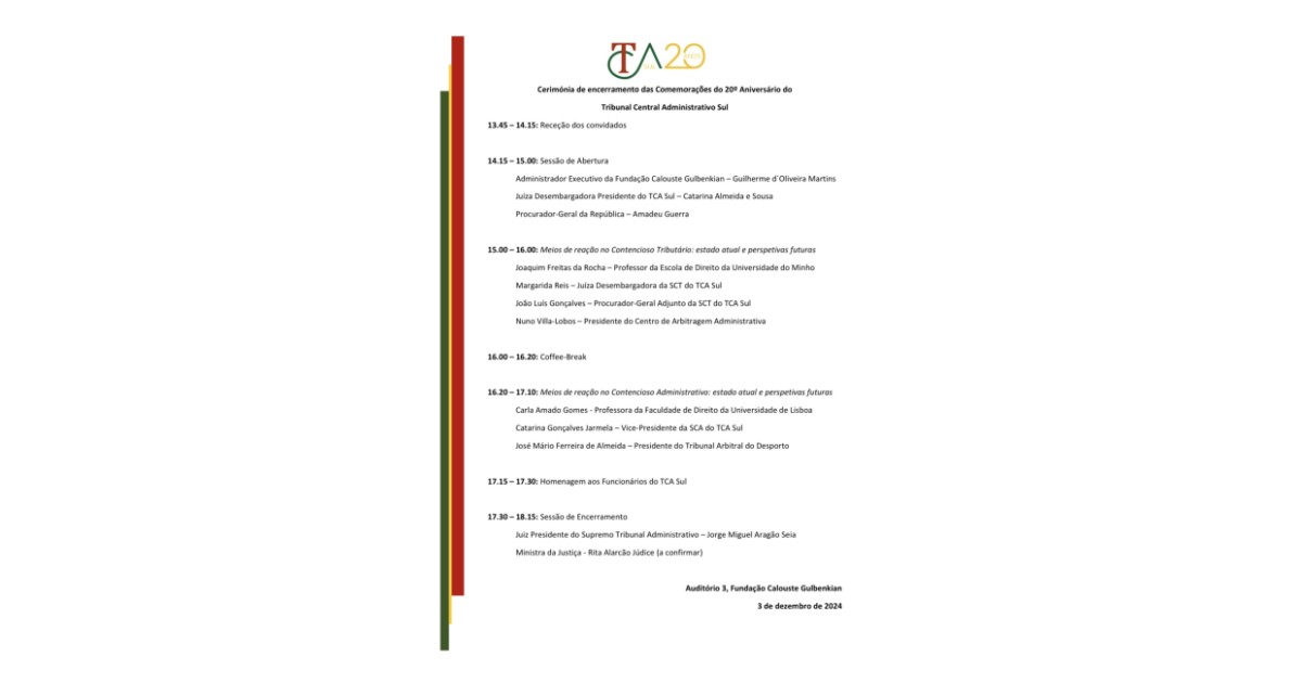 A convite da Senhora Desembargadora Presidente do Tribunal Central Administrativo Sul, o sócio Fundador da FALM José Mário Ferreira de Almeida participa como orador na cerimónia de encerramento das comemorações dos 20 anos deste tribunal, que se realizará no Auditório 3 da Fundação Calouste Gulbenkian no dia 3 de dezembro de 2024, com início pelas 14h15, abordando o tema “Meios de reação no Contencioso Administrativo: estado atual e perspetivas futuras”