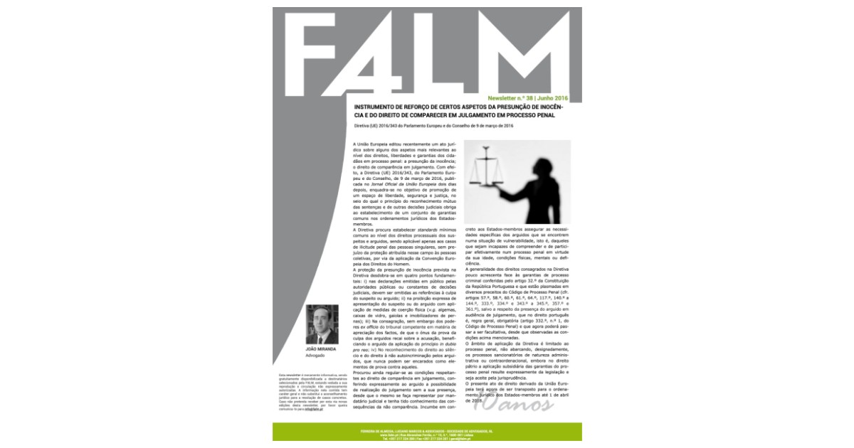 Instrumento de reforço de certos aspetos da presunção de Inocência e do direito de comparecer em julgamento em processo penal - Diretiva (UE) 2016/343 do Parlamento Europeu e do Conselho de 9 de março de 2016.